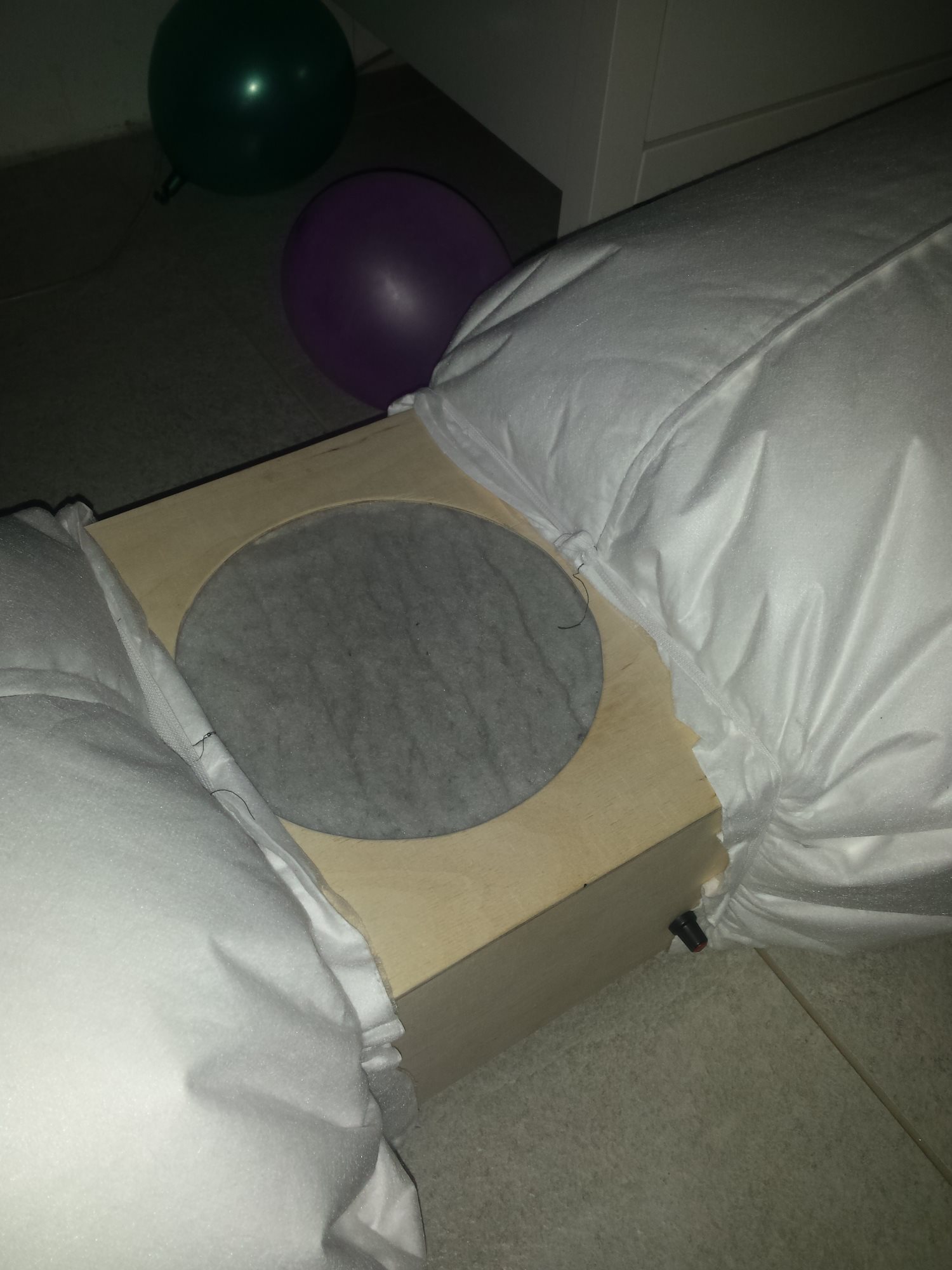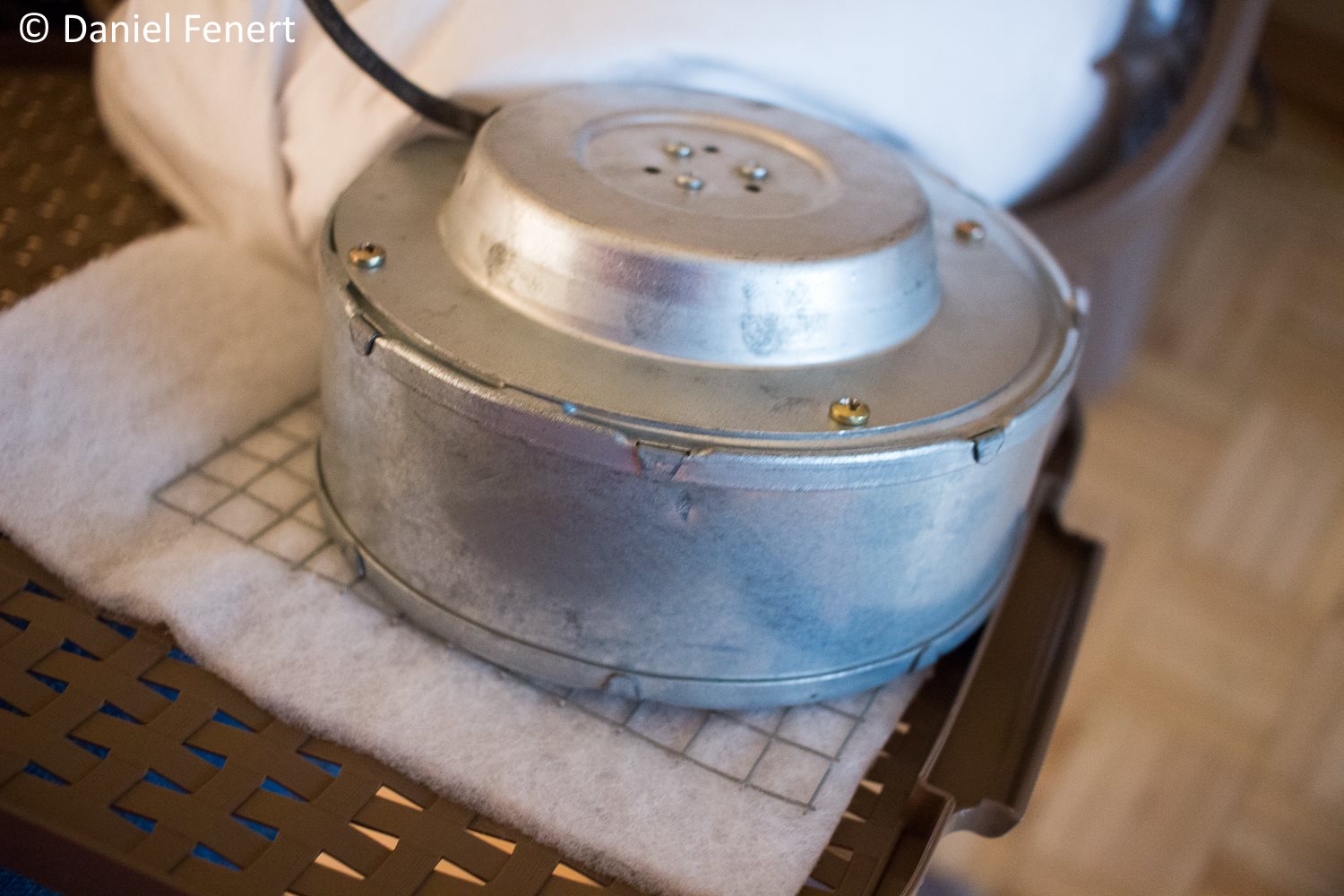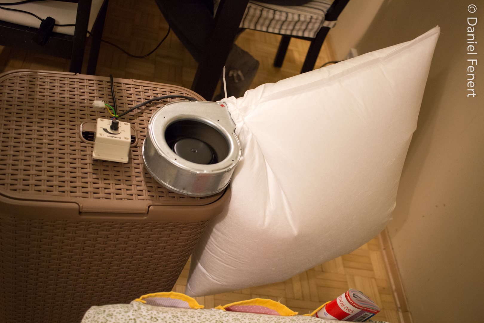 Z Filtra F9 nieoceniona małżonka uszyła worek mniej-więcej wielkości kosza na pranie który zamocowałem do wentylatora przy pomocy zipów, powierzchnia worka to około 1 m2.
