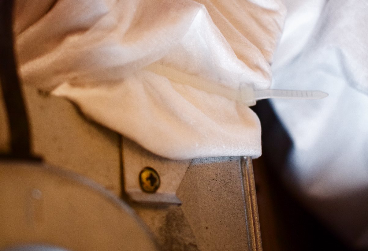 Worek z właściwego filtra przymocowany do wentylatora zipami + przyszyty ręcznie z jednej strony wokół zipa bo uciekał